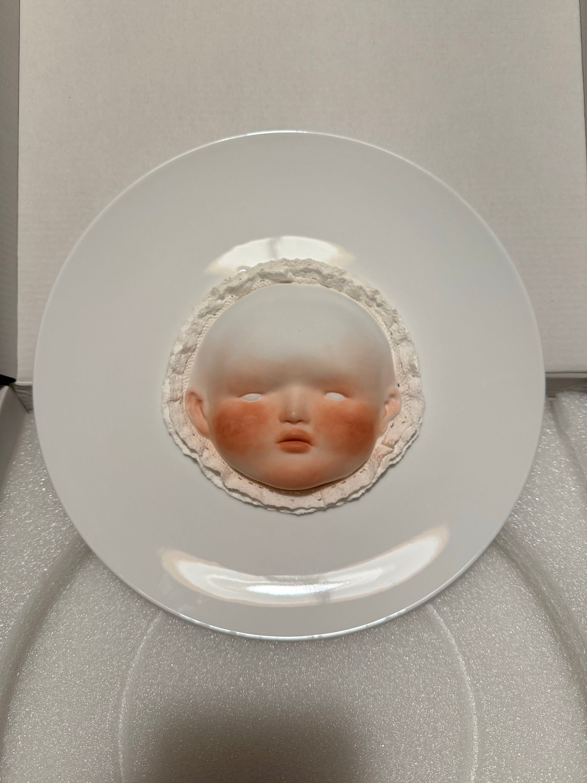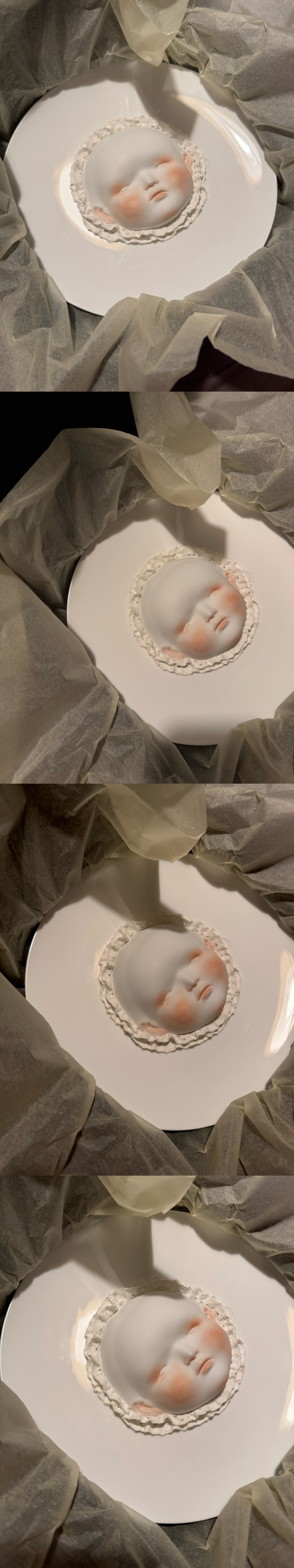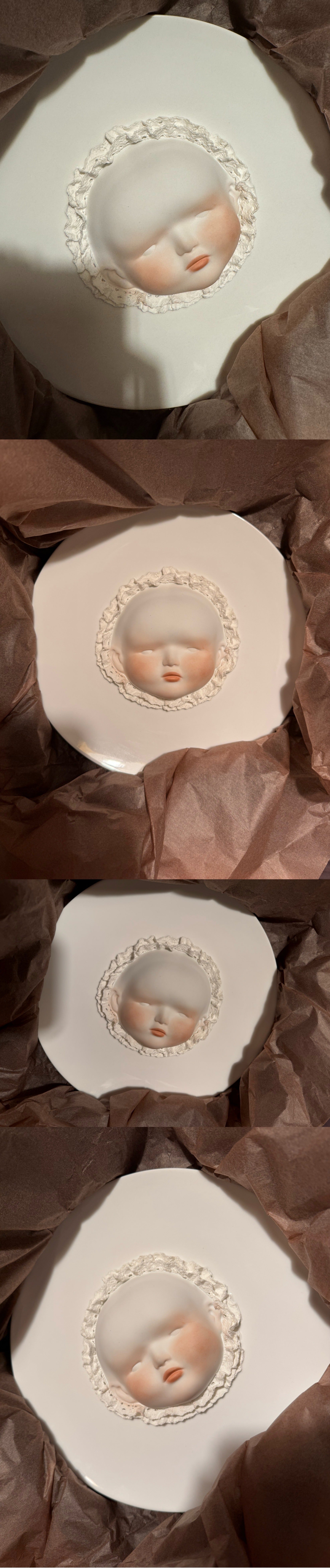 More than a plate,it's a sculptural statement.Framed by delicate lace-like edges, the porcelain baby face carries an uncanny yet captivating aura. Whether displayed on a wall or styled on a table, it transforms any interior into a conversation-worthy scene of art and intrigue.