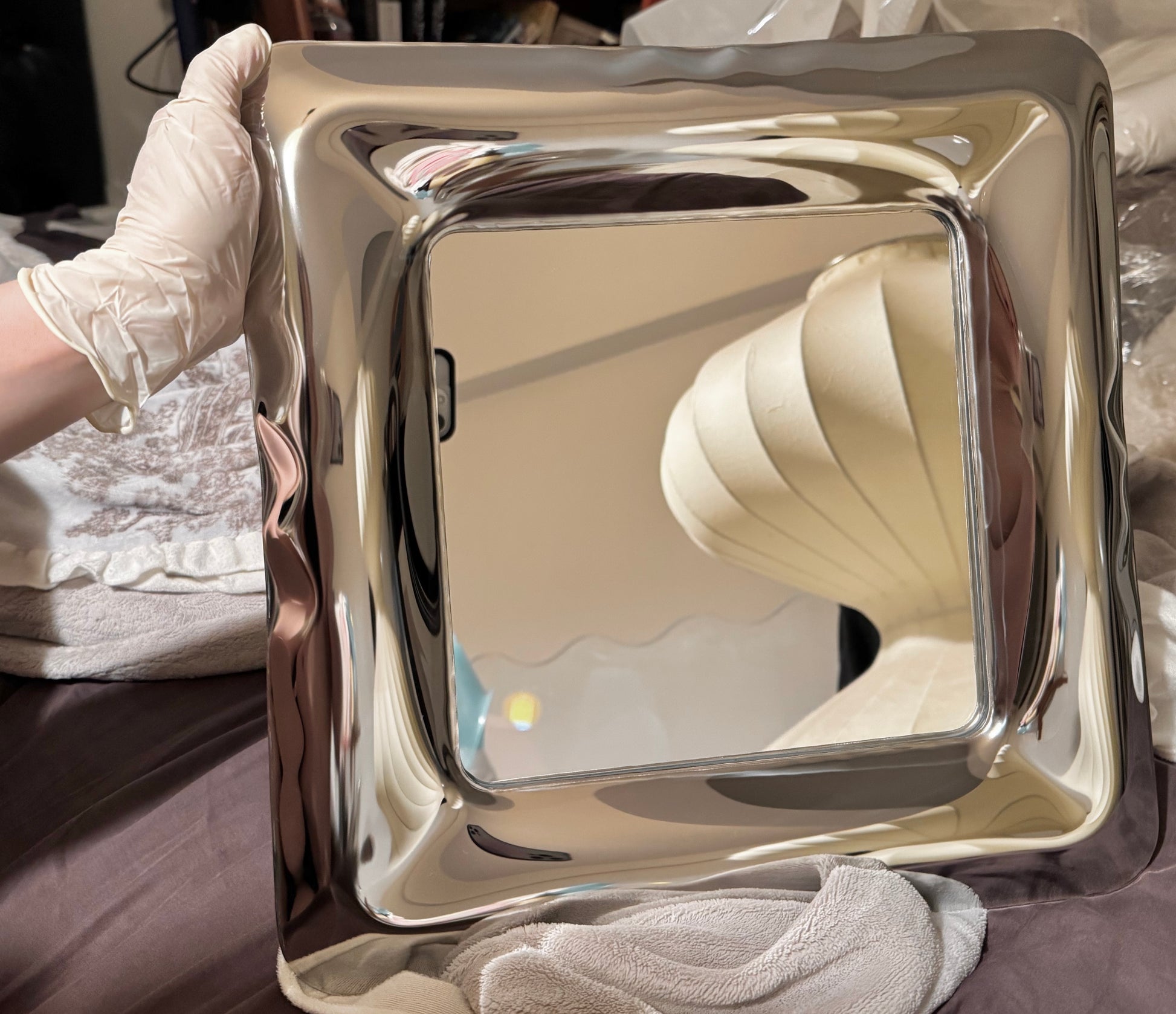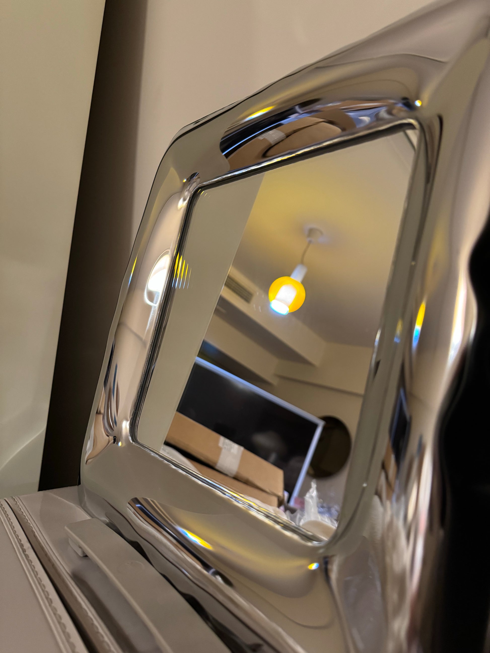 Its high-gloss stainless steel surface bends and plays with light, creating reflections that shift with every angle. The result is a mirror that not only shows your world, but reshapes it.
